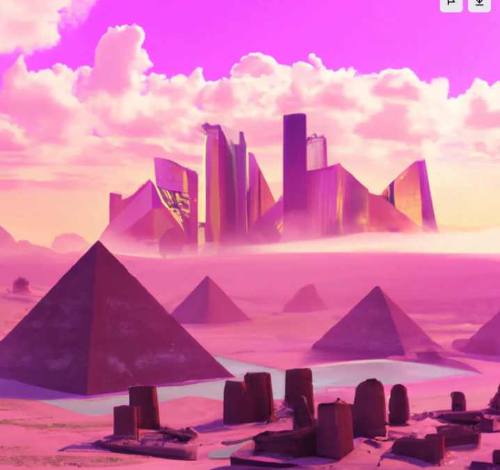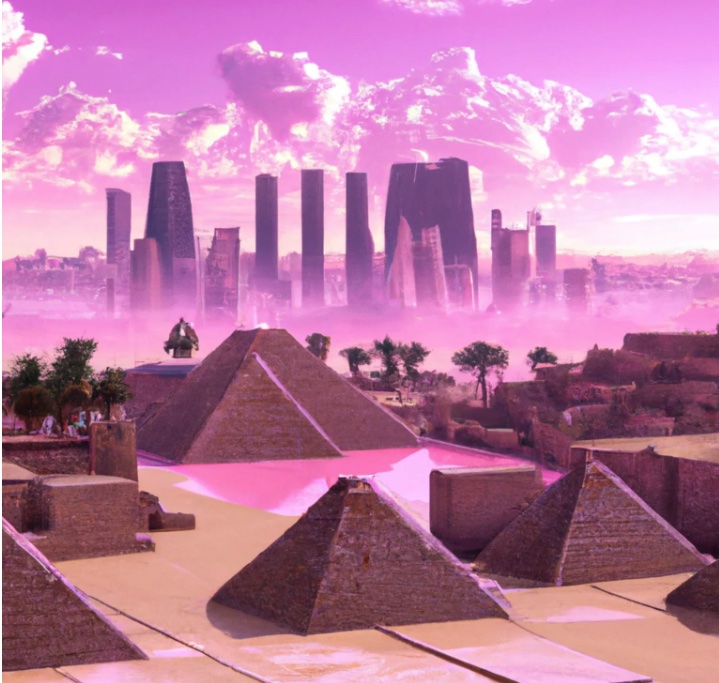 “ancient pyramids, skyscrapers, ancient amphitheater, modern city park all in one beautiful futuristic sparkling landscape with pink skies photo realism”