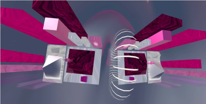 In the image below we have a look from one of the sides, showing the portal and the mirror on the other side; symbolizing a virtual parallel reality that’s simultaneously happening; one that some of us are reaching towards in our everyday virtual interactions. The repeating colors remind us that our bodies are made up of the same basic organic materials that our world is made of, a two way mirror of sorts.